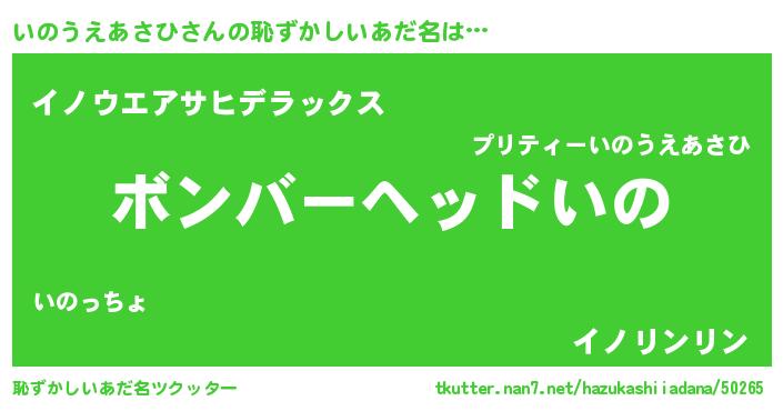 | 男性向けラノベタイトル風あだ名 | 『いのうえあさひ~年齢イコール彼女いない歴の魔法使い~』 |