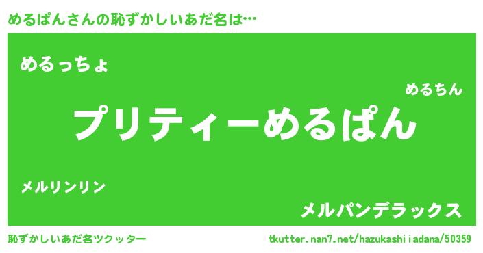 | 男性向けラノベタイトル風あだ名 | 『転生したらめるぱんだった件』 |