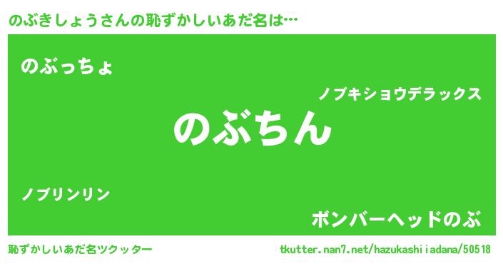 | 胡散臭い通販商品みたいなあだ名 | 『絶対に幸福をもたらす水素水…その名も「のぶきしょう」』 |