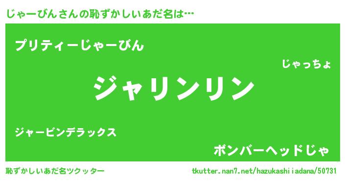| 男性向けラノベタイトル風あだ名 | 『じゃーびんの嫁は女の子じゃないと思った?』 |