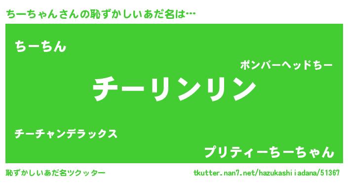 ちーちゃんさんの恥ずかしいあだ名は… 『チーリンリン』『ちーちん』『プリティーちーちゃん』 ツクッター #恥ずかしいあだ名ツクッター http://tkutter.nan7.net/hazukashiiadana/51367/