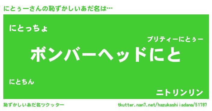 | ヘコむあだ名 | 『豆乳』『にとっぺ』『にともー』 |