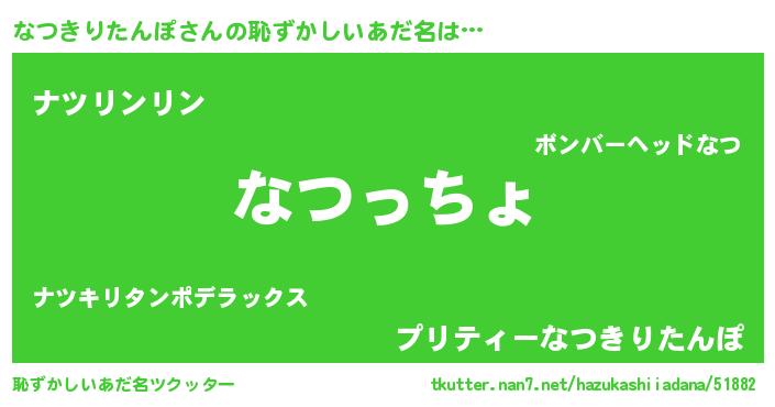 なつきりたんぽさんの恥ずかしいあだ名は… 『なつっちょ』『ナツリンリン』『プリティーなつきりたんぽ』 ツクッター #恥ずかしいあだ名ツクッター http://tkutter.nan7.net/hazukashiiadana/51882/