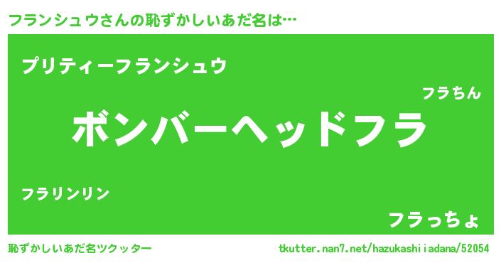 | 男性向けラノベタイトル風あだ名 | 『おまえをオタクにしてやるから、俺をフランシュウにしてくれ! 』 |