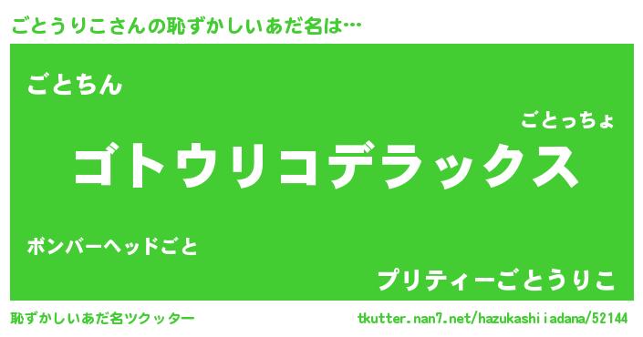 | 男性向けラノベタイトル風あだ名 | 『Re:ごとうりこから始める異世界生活』 |