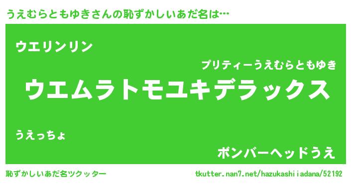うえむらともゆきさんの恥ずかしいあだ名は… 『ウエムラトモユキデラックス』『ウエリンリン』『ボンバーヘッドうえ』 ツクッター #恥ずかしいあだ名ツクッター http://tkutter.nan7.net/hazukashiiadana/52192/
