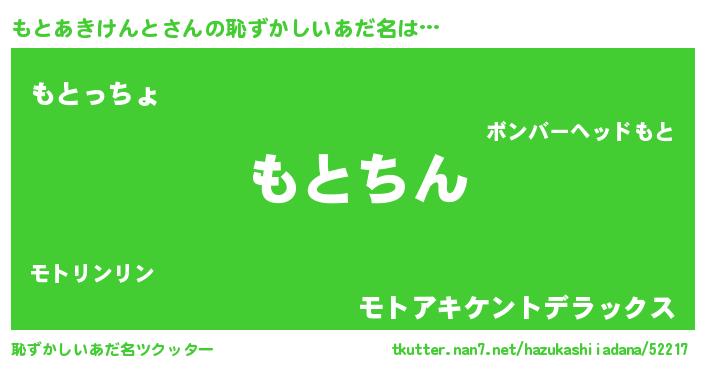 | 男性向けラノベタイトル風あだ名 | 『もとあきけんと~年齢イコール彼女いない歴の魔法使い~』 |