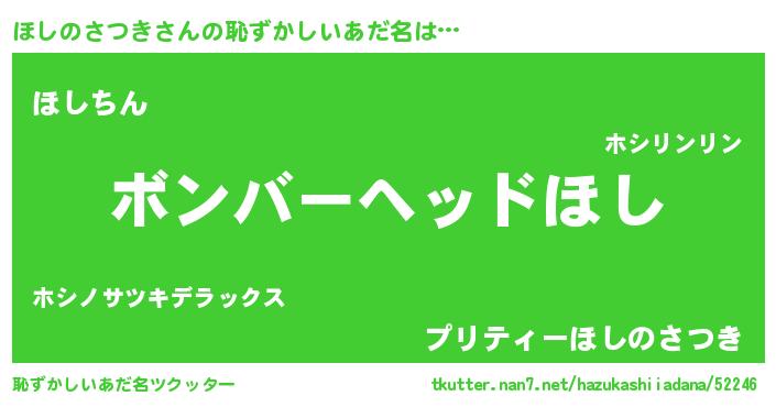 | 男性向けラノベタイトル風あだ名 | 『ほしのさつき~年齢イコール彼女いない歴の魔法使い~』 |