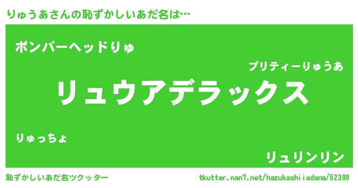 | 男性向けラノベタイトル風あだ名 | 『りゅうあ~年齢イコール彼女いない歴の魔法使い~』 |