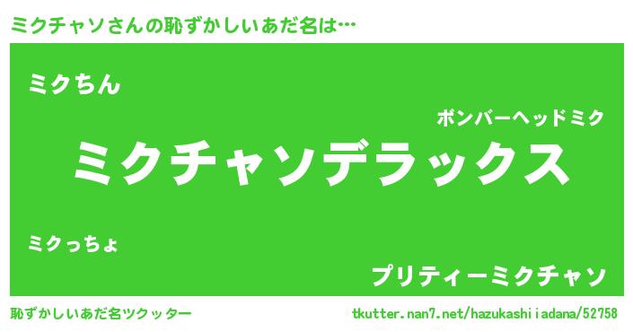 | 意味不明あだ名 | 『自称ミクチャソ』『永久保存ミクチャソ』 |