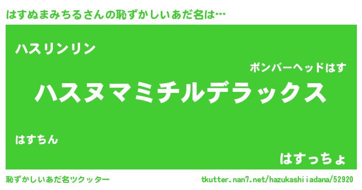 | 男性向けラノベタイトル風あだ名 | 『Re:はすぬまみちるから始める異世界生活』 |