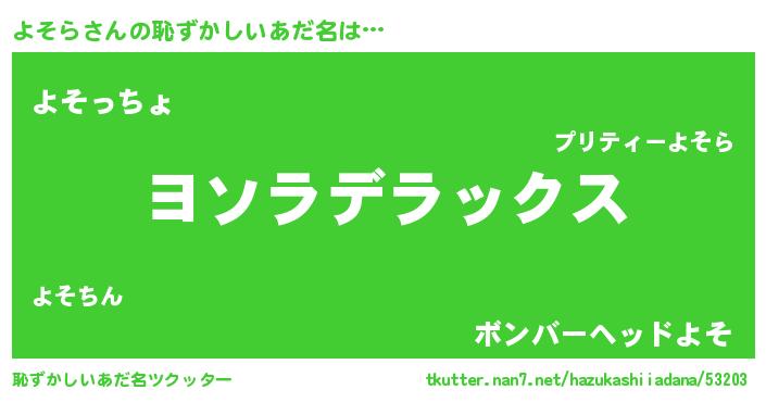 | 意味不明あだ名 | 『自称よそら』『住所不定無職よそら(1歳)』 |