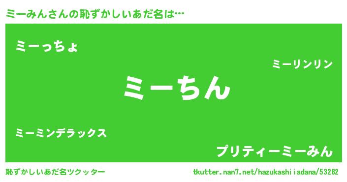 | 意味不明あだ名 | 『永久保存ミーみん』『ペロリンミーみん』 |