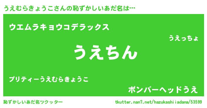 | 可愛いあだ名 | 『うえぷりん』『うえむらきょうこママ』 |