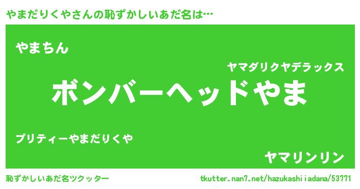 やまだりくやさんの恥ずかしいあだ名は… 『ボンバーヘッドやま』『やまちん』『ヤマリンリン』 ツクッター #恥ずかしいあだ名ツクッター http://tkutter.nan7.net/hazukashiiadana/53771/