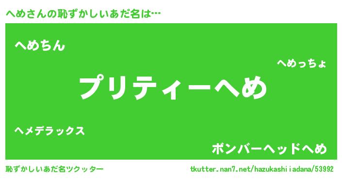| ヘコむあだ名 | 『へめもー』『へめ(遠い目)』『豆乳』 |