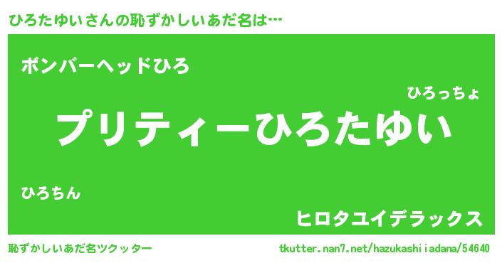 ひろたゆいさんの恥ずかしいあだ名は… 『プリティーひろたゆい』『ボンバーヘッドひろ』『ヒロタユイデラックス』 ツクッター #恥ずかしいあだ名ツクッター http://tkutter.nan7.net/hazukashiiadana/54640/