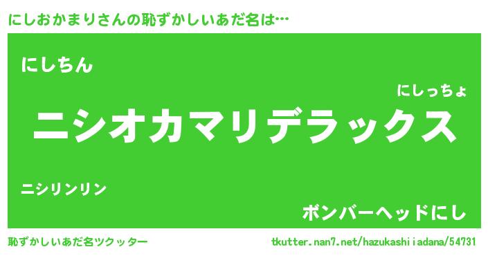 | 男性向けラノベタイトル風あだ名 | 『Re:にしおかまりから始める異世界生活』 |