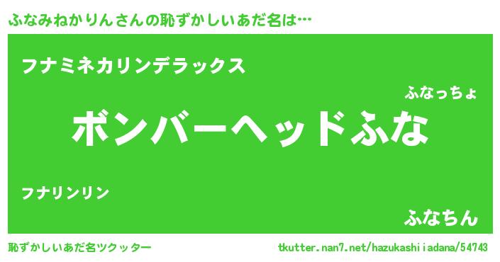 | 男性向けラノベタイトル風あだ名 | 『おまえをオタクにしてやるから、俺をふなみねかりんにしてくれ! 』 |