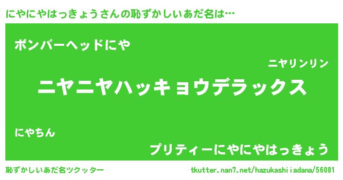 | 男性向けラノベタイトル風あだ名 | 『この素晴らしい世界ににやにやはっきょうを!』 |