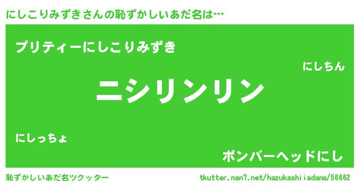 にしこりみずきさんの恥ずかしいあだ名は… 『ニシリンリン』『プリティーにしこりみずき』『ボンバーヘッドにし』 ツクッター #恥ずかしいあだ名ツクッター http://tkutter.nan7.net/hazukashiiadana/56662/
