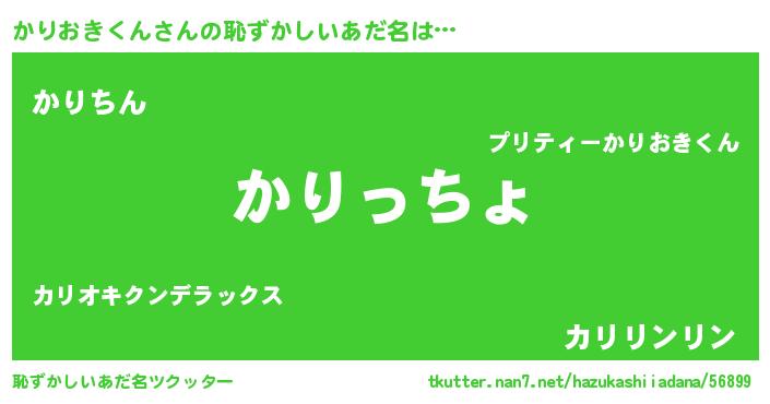 かりおきくんさんの恥ずかしいあだ名は… 『かりっちょ』『かりちん』『カリリンリン』 ツクッター #恥ずかしいあだ名ツクッター http://tkutter.nan7.net/hazukashiiadana/56899/