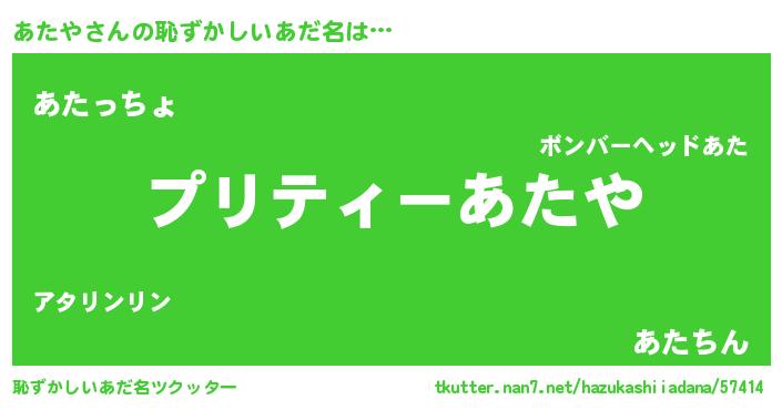 | 男性向けラノベタイトル風あだ名 | 『魔弾の王とあたや』『あたやの憂鬱』 |