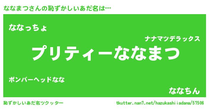 | 男性向けラノベタイトル風あだ名 | 『この素晴らしい世界にななまつを!』 |