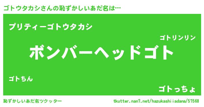 | 男性向けラノベタイトル風あだ名 | 『ゴトウタカシ~年齢イコール彼女いない歴の魔法使い~』 |