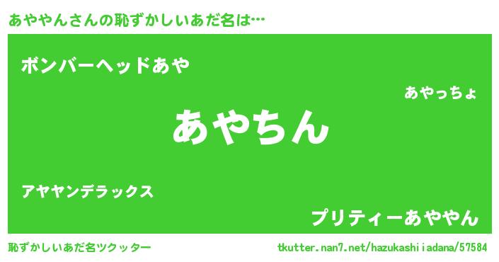あややんさんの恥ずかしいあだ名は… 『あやちん』『ボンバーヘッドあや』『プリティーあややん』 ツクッター #恥ずかしいあだ名ツクッター http://tkutter.nan7.net/hazukashiiadana/57584/