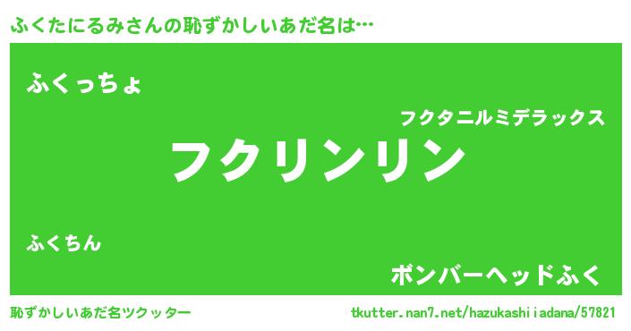 | 男性向けラノベタイトル風あだ名 | 『ふくたにるみ~年齢イコール彼女いない歴の魔法使い~』 |