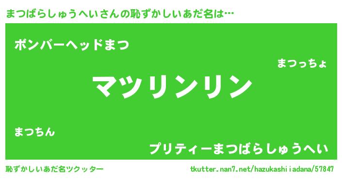 | 男性向けラノベタイトル風あだ名 | 『うちのまつばらしゅうへいが世界を掌握している!』 |