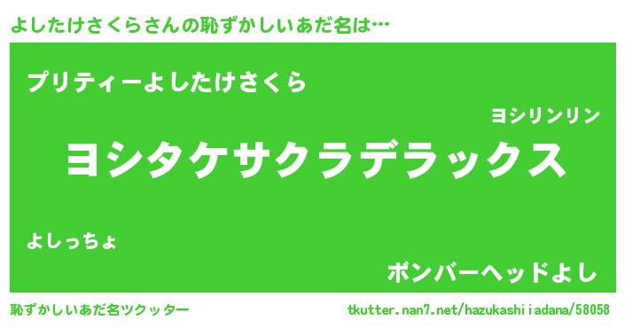 | 意味不明あだ名 | 『自称よしたけさくら』 |