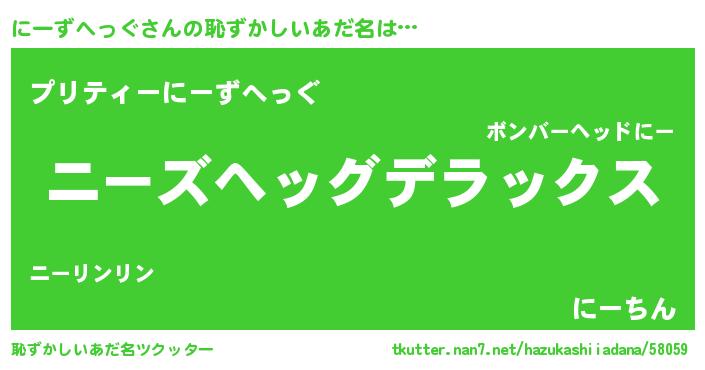 | 男性向けラノベタイトル風あだ名 | 『Re:にーずへっぐから始める異世界生活』 |