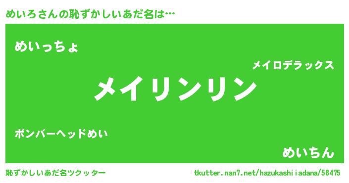 | 欧米人風あだ名 | 『アンジェラ・めいろ』『ウサインめいろ』 |