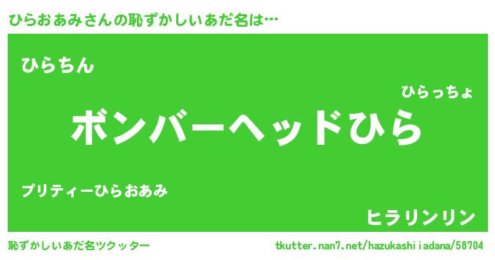 | ヘコむあだ名 | 『ひらおあみ(笑)』『ひらっちょ』 |