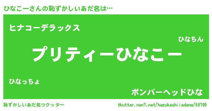 | 男性向けラノベタイトル風あだ名 | 『魔弾の王とひなこー』『ひなこーの憂鬱』 |