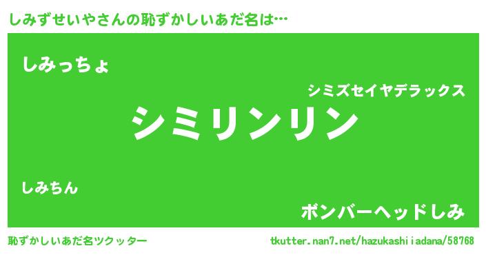 しみずせいやさんの恥ずかしいあだ名は… 『シミリンリン』『しみっちょ』『ボンバーヘッドしみ』 ツクッター #恥ずかしいあだ名ツクッター http://tkutter.nan7.net/hazukashiiadana/58768/