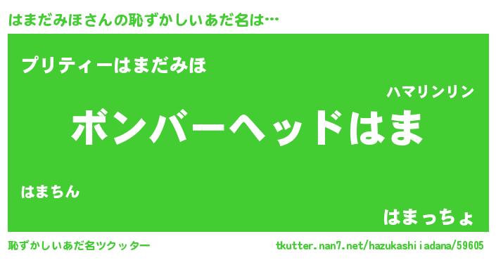 はまだみほさんの恥ずかしいあだ名は… 『ボンバーヘッドはま』『プリティーはまだみほ』『はまっちょ』 ツクッター #恥ずかしいあだ名ツクッター http://tkutter.nan7.net/hazukashiiadana/59605/