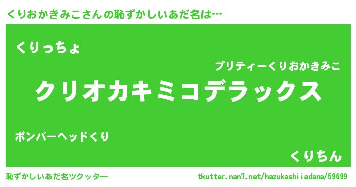 | 男性向けラノベタイトル風あだ名 | 『Re:くりおかきみこから始める異世界生活』 |