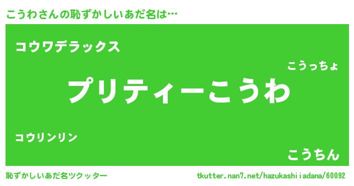 | 男性向けラノベタイトル風あだ名 | 『この素晴らしい世界にこうわを!』 |
