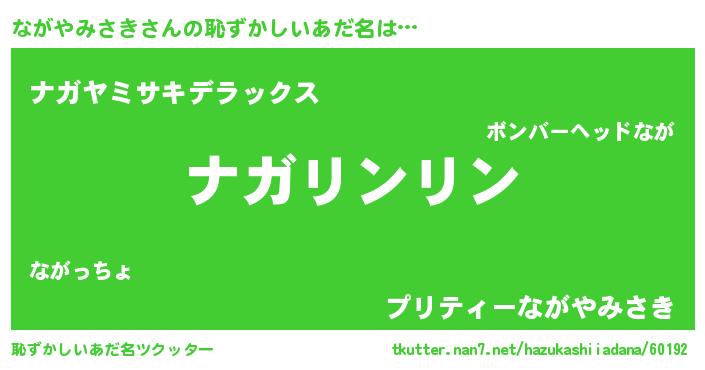 | 男性向けラノベタイトル風あだ名 | 『ながやみさきの嫁は女の子じゃないと思った?』 |