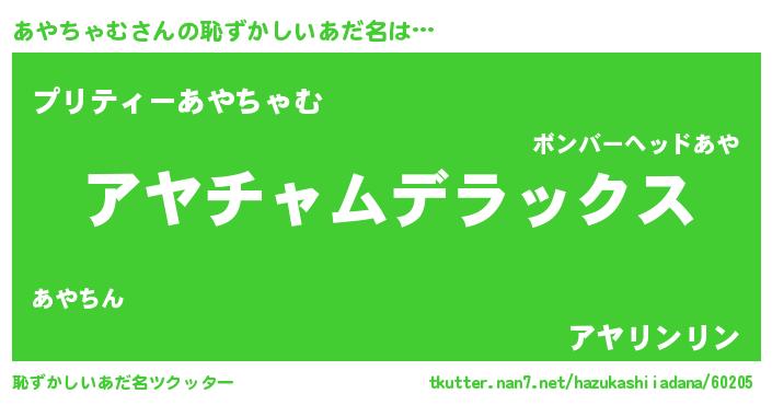 | 男性向けラノベタイトル風あだ名 | 『Re:あやちゃむから始める異世界生活』 |