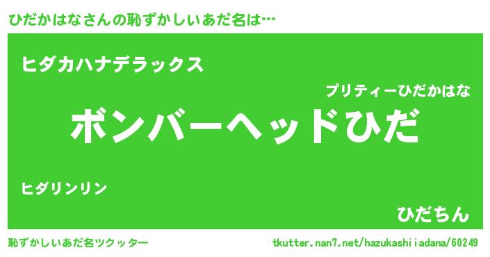 | 男性向けラノベタイトル風あだ名 | 『ひだかはな~年齢イコール彼女いない歴の魔法使い~』 |