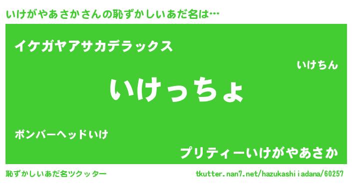 いけがやあさかさんの恥ずかしいあだ名は… 『いけっちょ』『イケガヤアサカデラックス』『プリティーいけがやあさか』 ツクッター #恥ずかしいあだ名ツクッター http://tkutter.nan7.net/hazukashiiadana/60257/