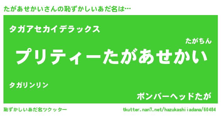| 男性向けラノベタイトル風あだ名 | 『たがあせかい~年齢イコール彼女いない歴の魔法使い~』 |