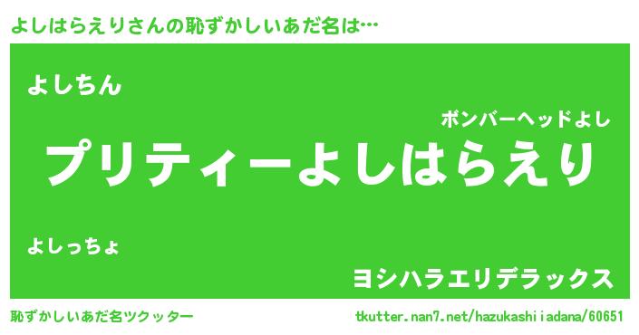 | ヘコむあだ名 | 『よしっふぃ~』『よしはらえり(小並感)』 |