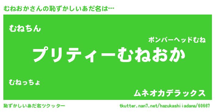 | 意味不明あだ名 | 『ペロリンむねおか』『永久保存むねおか』 |