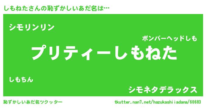| 男性向けラノベタイトル風あだ名 | 『しもねたの憂鬱』『シモネタスレイヤー』 |
