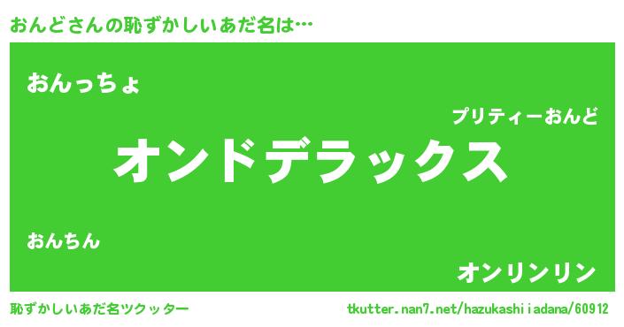 | 男性向けラノベタイトル風あだ名 | 『Re:おんどから始める異世界生活』 |